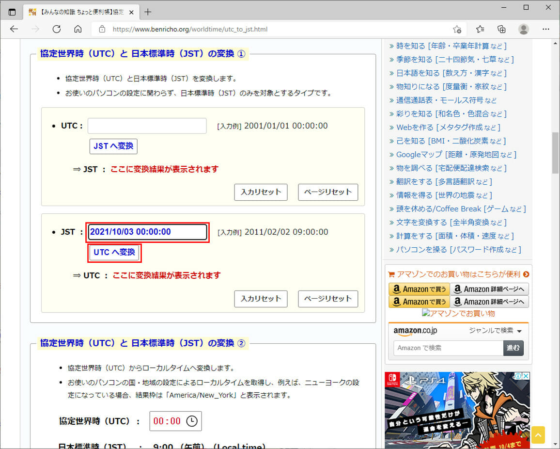 例えば、日本時間で2021/10/3(日) 午前0時のUTC時間は、上記サイト上で以下のようにして、2021/10/2(土) 15:00であることが算出できる。