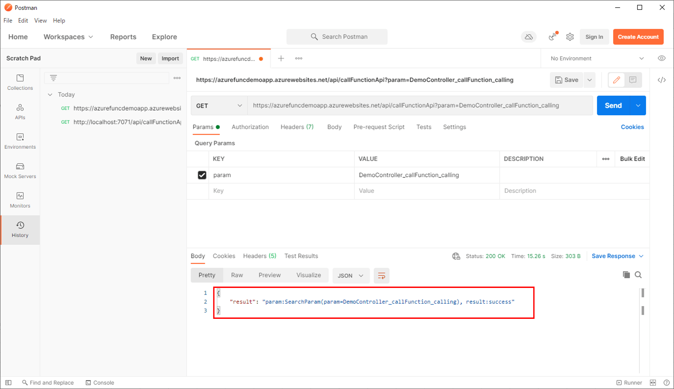 Azure環境でのAzure FunctionsやAPI ManagementのAPIも、Postmanを利用して実行できる。その結果は、以下の通り。