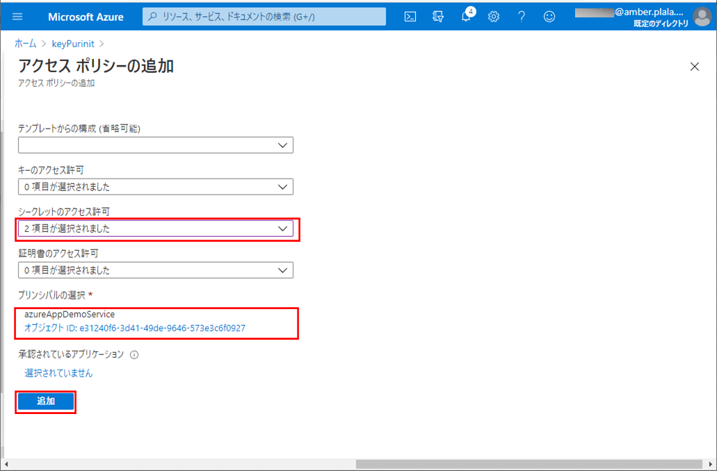 キーコンテナから先ほど作成したサービスプリンシパルにアクセスできるようにするために、キーコンテナーのアクセスポリシーを変更する。その手順は以下の通り。