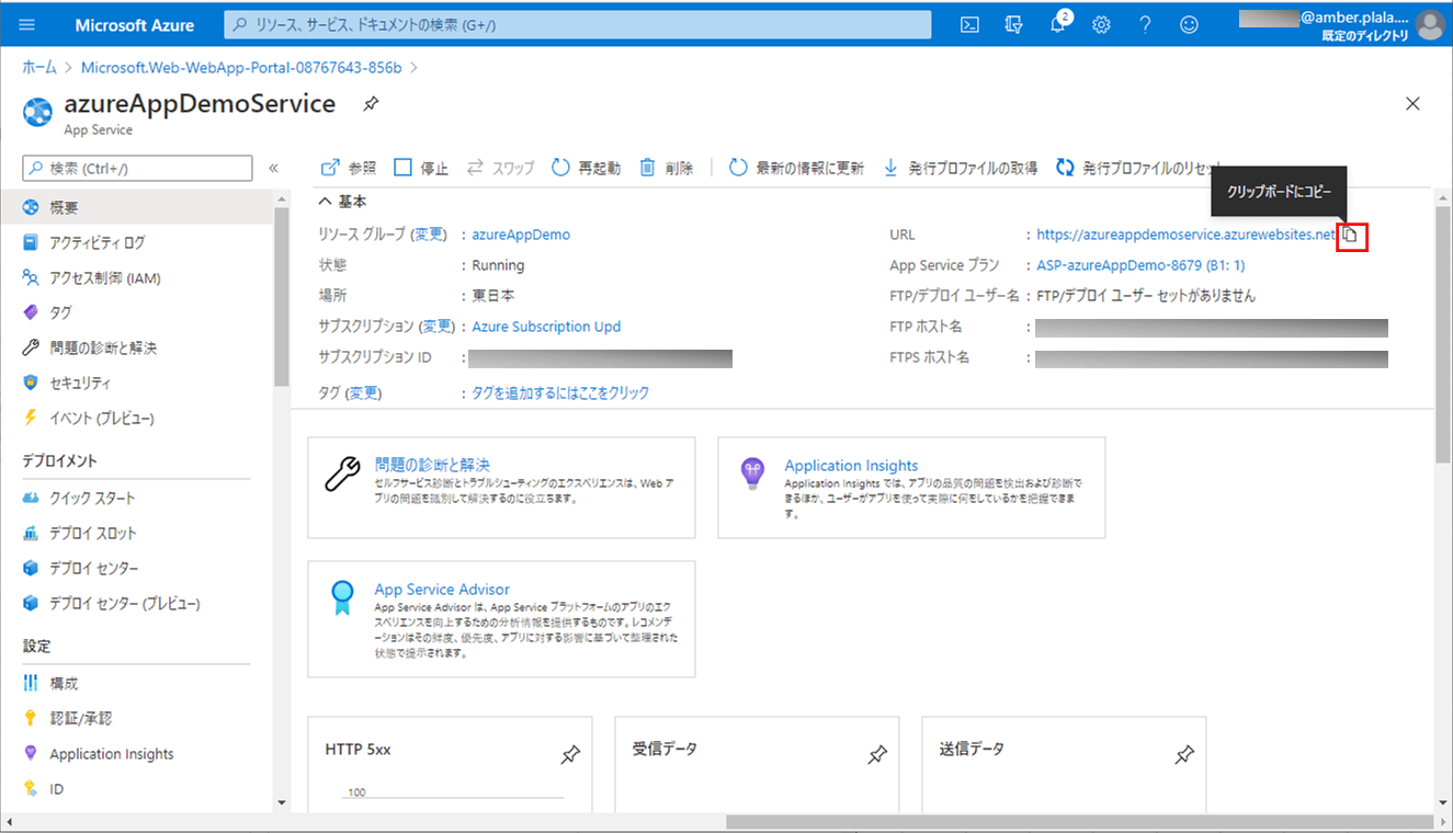 8) 作成したApp Serviceの概要画面に移動し、以下のようにAppService名やリソースグループ・リージョン等が確認できる。