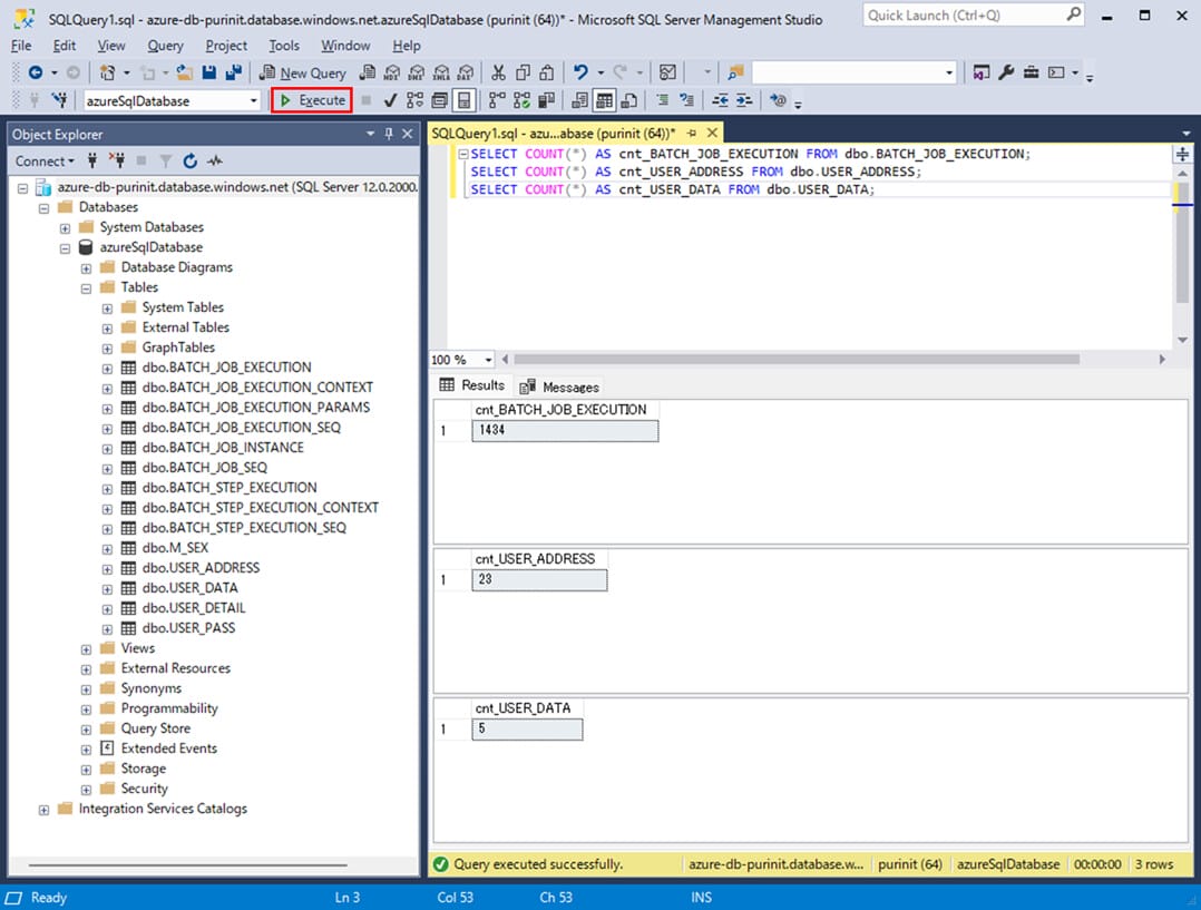SELECT COUNT(*) AS cnt_BATCH_JOB_EXECUTION FROM dbo.BATCH_JOB_EXECUTION; SELECT COUNT(*) AS cnt_USER_ADDRESS FROM dbo.USER_ADDRESS; SELECT COUNT(*) AS cnt_USER_DATA FROM dbo.USER_DATA;