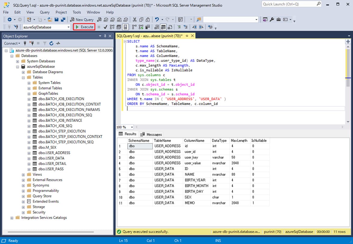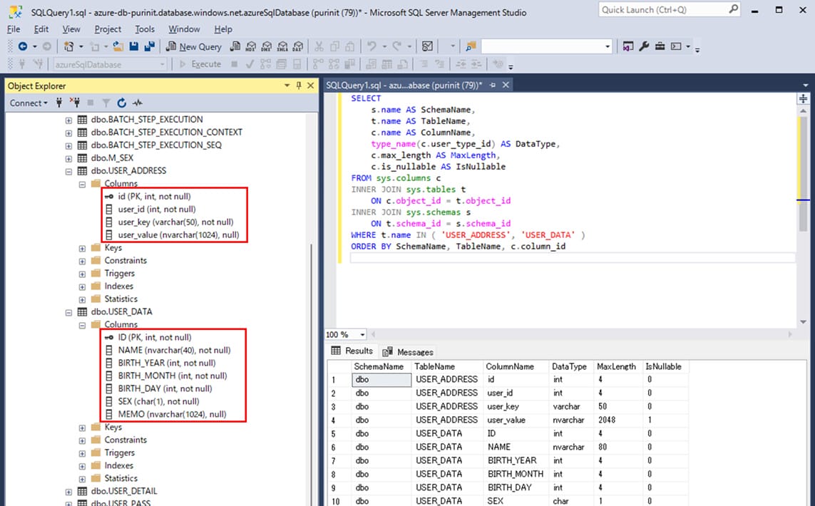 SELECT s.name AS SchemaName, t.name AS TableName, c.name AS ColumnName, type_name(c.user_type_id) AS DataType, c.max_length AS MaxLength, c.is_nullable AS IsNullable FROM sys.columns c INNER JOIN sys.tables t ON c.object_id = t.object_id INNER JOIN sys.schemas s ON t.schema_id = s.schema_id WHERE t.name IN ( 'USER_ADDRESS', 'USER_DATA' ) ORDER BY SchemaName, TableName, c.column_id