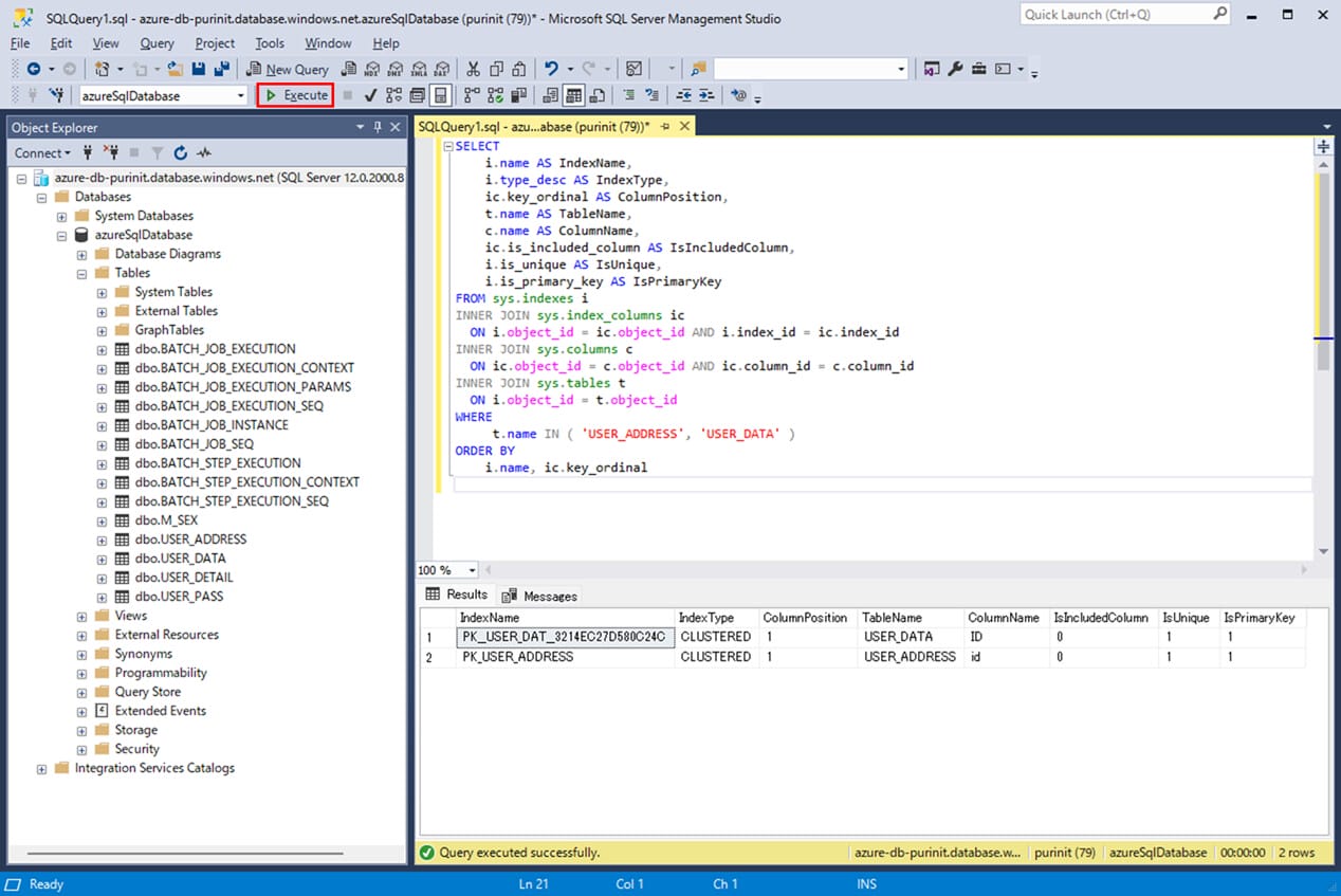 5) 各テーブルのインデックス情報を取得するSQLとその実行結果は、以下の通り。今回は、特定のテーブル(USER_ADDRESS・USER_DATA)に限定している。