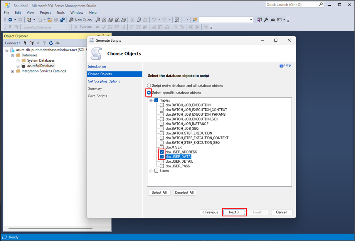 3) 表示したいテーブルやユーザーを選択し、「Next」ボタンを押下する。なお、「Select entire database and all database objects」を指定すれば、データベース全体のテーブルやユーザー情報を出力できる。