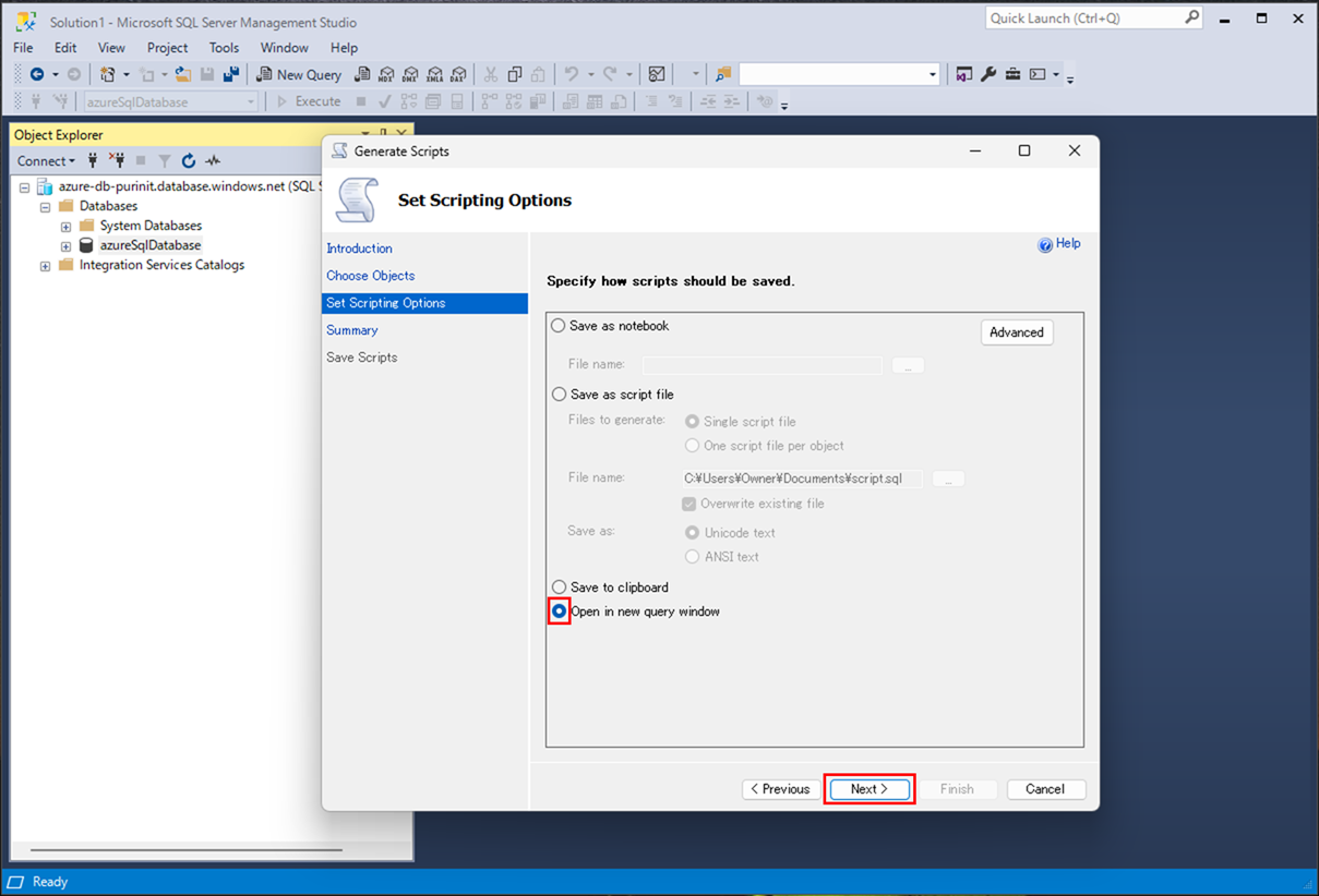 4) 出力結果の保存先を選択し、「Next」ボタンを押下する。ここでは、「Open in new query window」(新しいクエリウィンドウ上)を選択している。