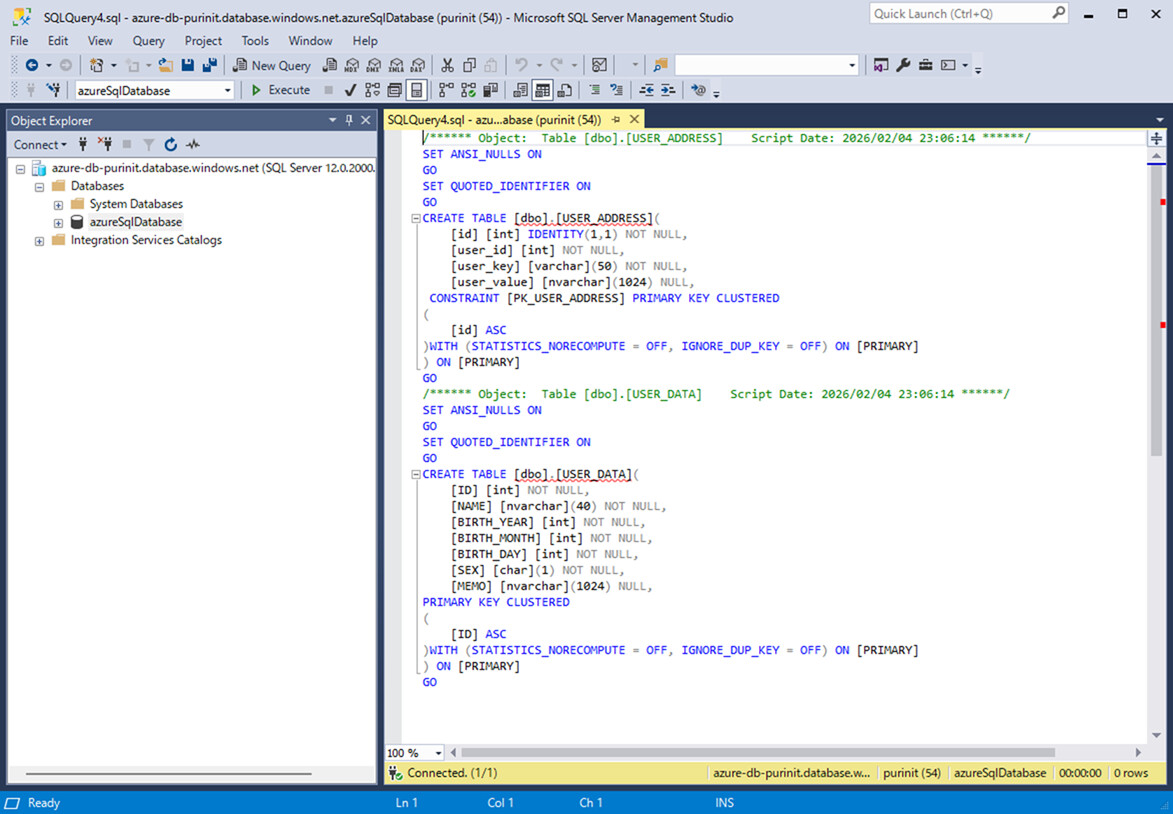 /****** Object: Table [dbo].[USER_ADDRESS] Script Date: 2026/02/04 23:06:14 ******/ SET ANSI_NULLS ON GO SET QUOTED_IDENTIFIER ON GO CREATE TABLE [dbo].[USER_ADDRESS]( [id] [int] IDENTITY(1,1) NOT NULL, [user_id] [int] NOT NULL, [user_key] [varchar](50) NOT NULL, [user_value] [nvarchar](1024) NULL, CONSTRAINT [PK_USER_ADDRESS] PRIMARY KEY CLUSTERED ( [id] ASC )WITH (STATISTICS_NORECOMPUTE = OFF, IGNORE_DUP_KEY = OFF) ON [PRIMARY] ) ON [PRIMARY] GO /****** Object: Table [dbo].[USER_DATA] Script Date: 2026/02/04 23:06:14 ******/ SET ANSI_NULLS ON GO SET QUOTED_IDENTIFIER ON GO CREATE TABLE [dbo].[USER_DATA]( [ID] [int] NOT NULL, [NAME] [nvarchar](40) NOT NULL, [BIRTH_YEAR] [int] NOT NULL, [BIRTH_MONTH] [int] NOT NULL, [BIRTH_DAY] [int] NOT NULL, [SEX] [char](1) NOT NULL, [MEMO] [nvarchar](1024) NULL, PRIMARY KEY CLUSTERED ( [ID] ASC )WITH (STATISTICS_NORECOMPUTE = OFF, IGNORE_DUP_KEY = OFF) ON [PRIMARY] ) ON [PRIMARY] GO