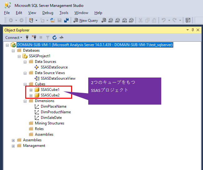 1) SQL Server Analysis ServerへのSQL Server Analysis Services(SSAS)プロジェクトのデプロイ済であるSQL Server搭載済仮想マシンに、test_sqlserverローカルユーザーでログインした状態で、下図のように、2つのキューブを持ったSSASプロジェクトを、SQL Server Analysis Serverにデプロイ