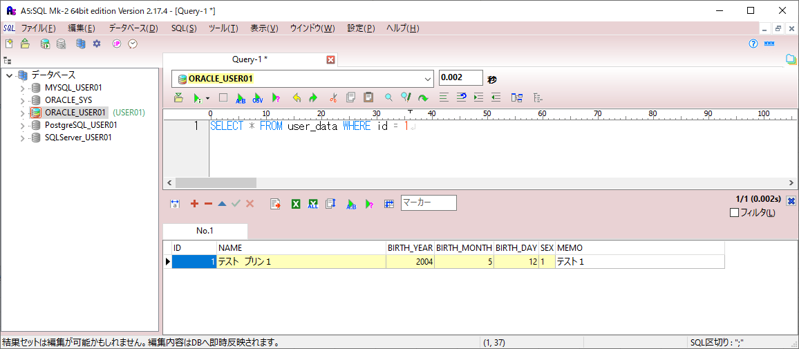 5) Oracleのデータを確認すると、SQLファイルに記載した内容に従ってデータ更新されていることが確認できる。