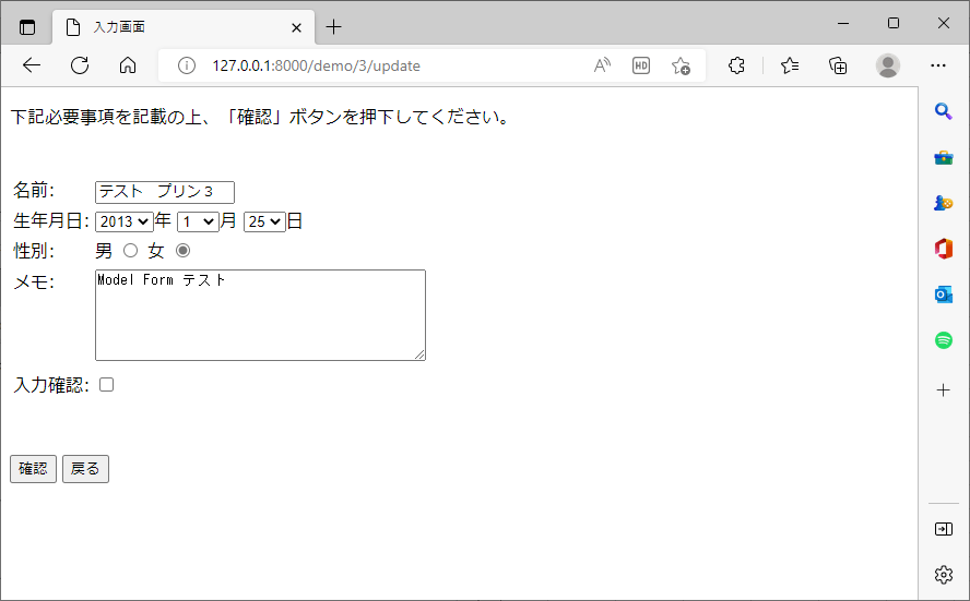 8) 以下のように、入力画面が表示されID=3のデータが表示されることが確認できる。ここで「戻る」ボタンを押下する。