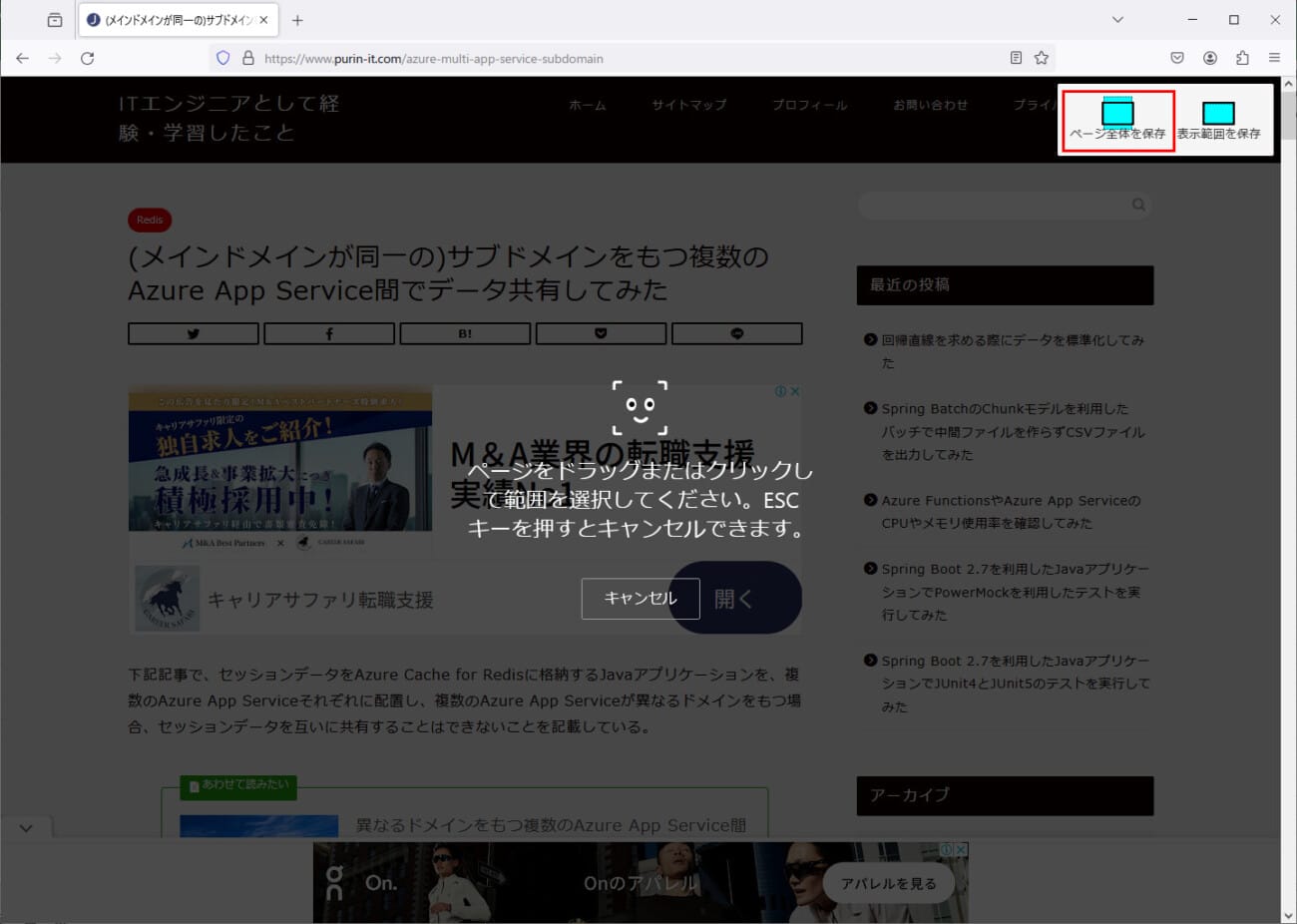 2) Ctrl + Shift + Sを押下し、「ページ全体をキャプチャ」を押下する。