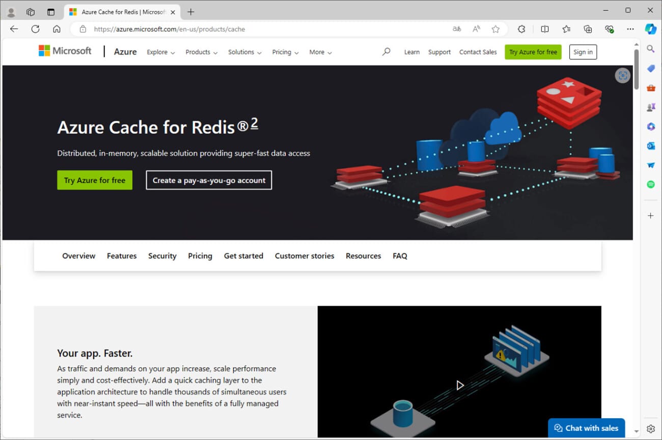 1) ブラウザ(Edge)上で、英語で書かれたページ(https://azure.microsoft.com/en-us/products/cache)を表示する。