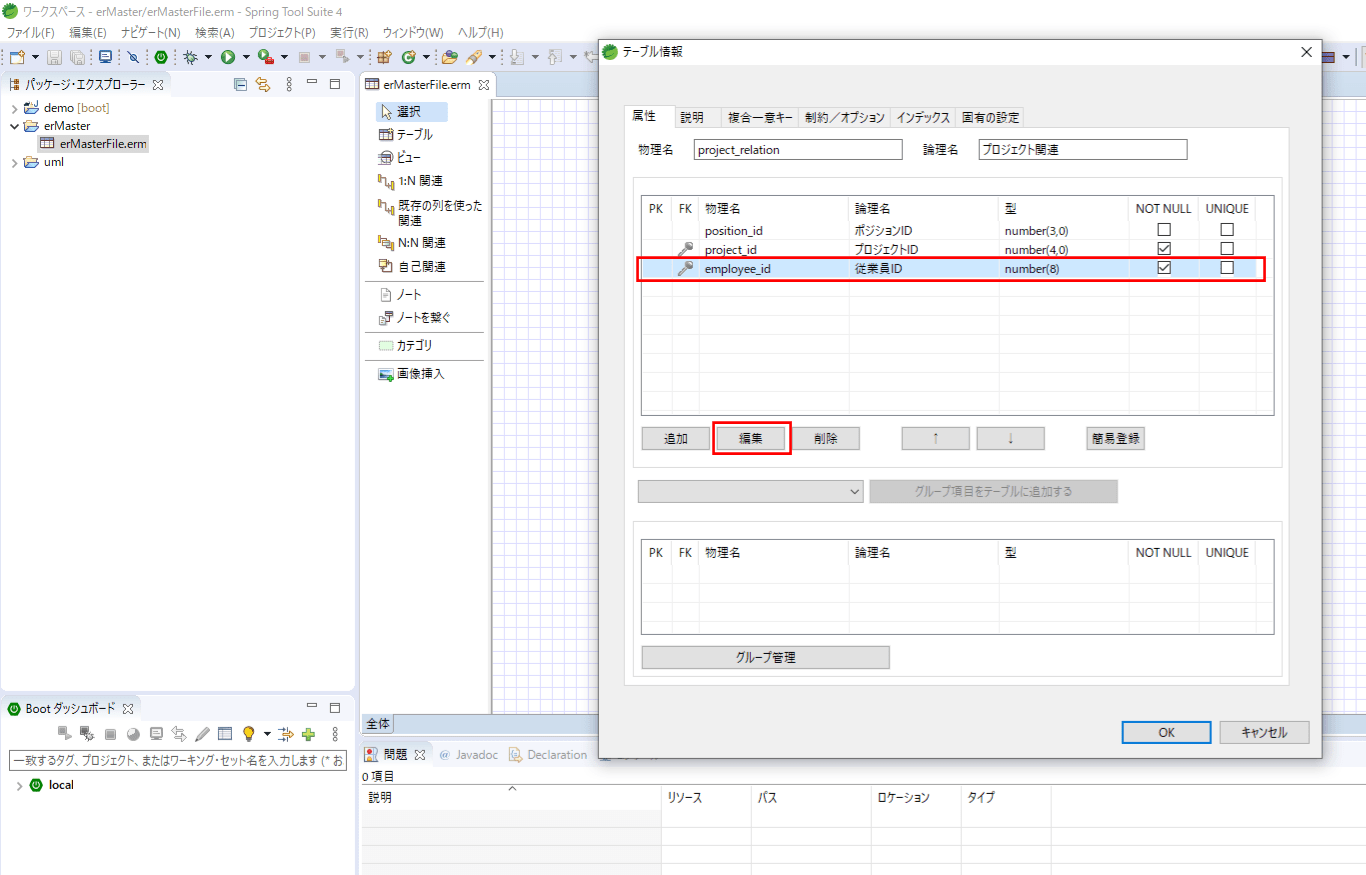 11) 同様に、従業員(employee)テーブル、プロジェクト関連(project_relation)テーブルも追加する。ただし、プロジェクト関連(project_relation)テーブルの主キー項目は、次の「テーブル間の関連の作成」で追加するため、ここでは追加していない