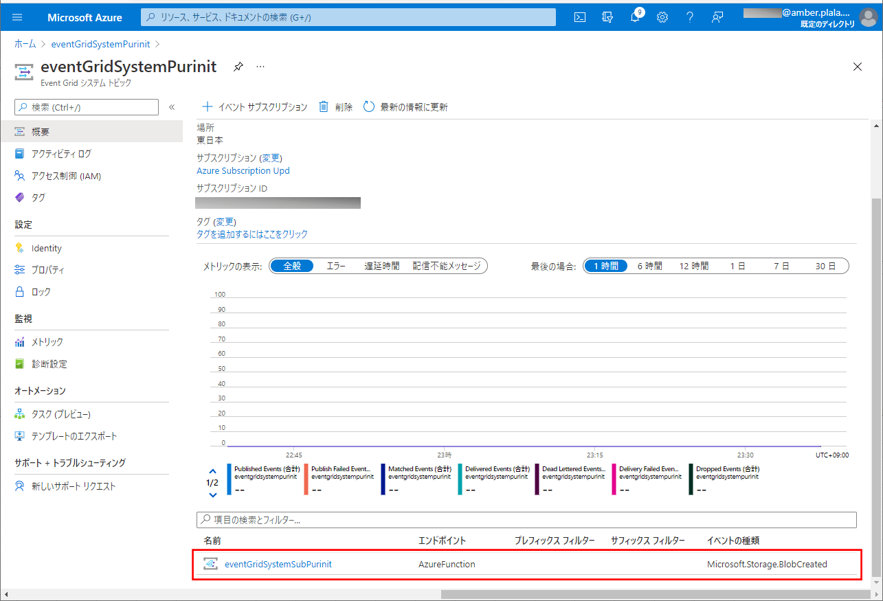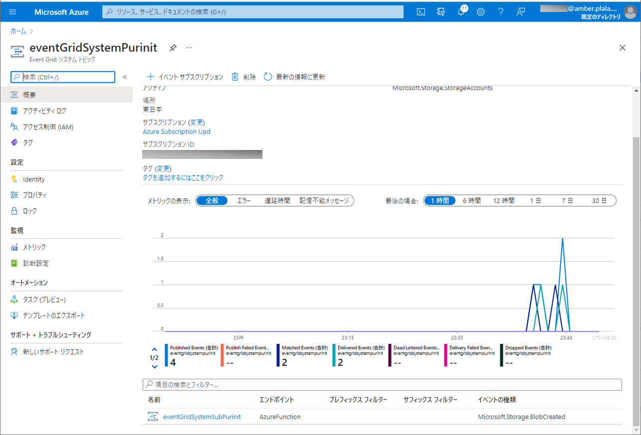 なお、イベントグリッドによる動作が行われると、以下のように、Event Gridシステムトピックの概要欄にメトリックが表示される。