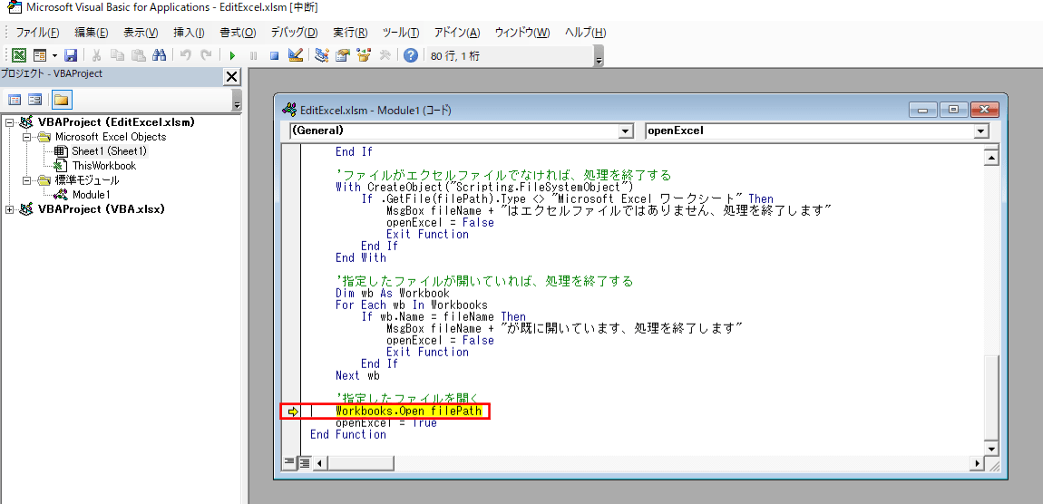 デバッグすると、以下のように、「Workbooks.Open」メソッドの位置で中断していることが確認できる