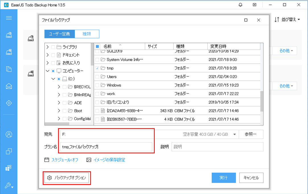 5) 宛先にバックアップ先のFドライブを選択し、プラン名を「tmp_ファイルバックアップ」と変更し、「バックアップオプション」ボタンを押下する。