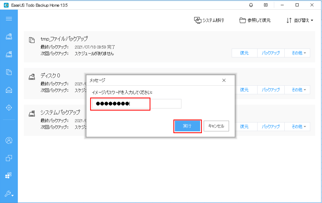 3) バックアップ時にパスワードを指定したため、以下の画面で指定したパスワードを入力し、「実行」ボタンを押下する。