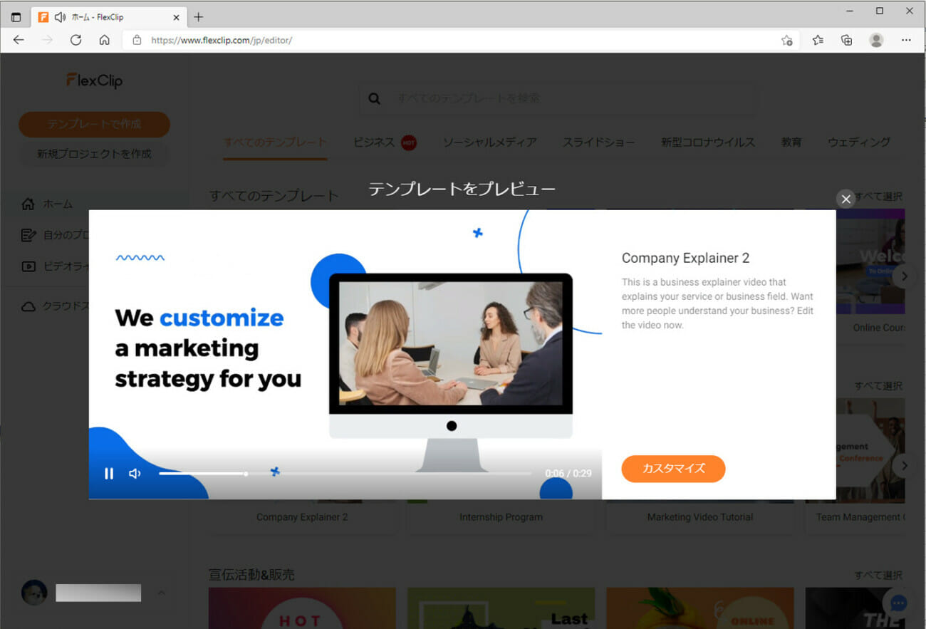 1) FlexClipにログインすると、以下のように、用意されている動画のテンプレートがいくつか表示されることが確認できる。