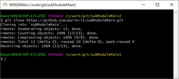 4) 「git clone (親モジュールのURL)」 を実行し、GitHubからリポジトリ「subModuleMain」の内容をローカルに取得する。