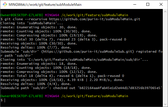 4) 「git clone –recursive (親モジュールのURL)」 を実行し、GitHubからリポジトリ「subModuleMain」の内容を、サブモジュールの内容も含め、ローカルに取得する。
