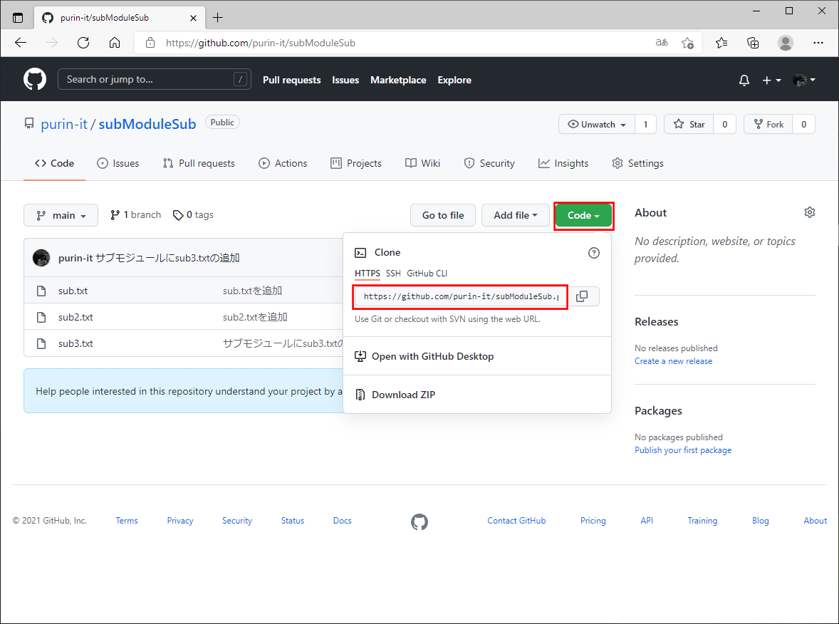 3) GitHub上でサブモジュールを開き、「Code」ボタンを押下すると、サブモジュールのURLが確認できる。ここで確認したURLは「https://github.com/purin-it/subModuleSub.git」となる。