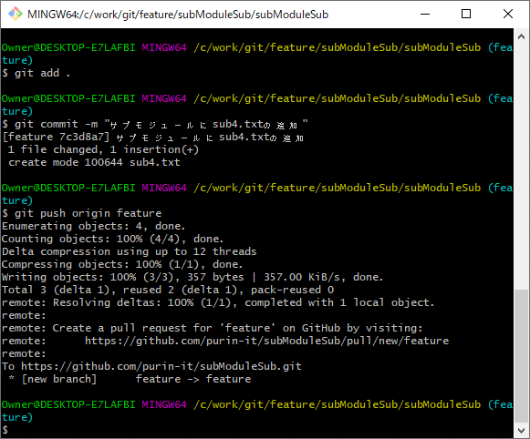 サブモジュールをローカル端末に取得し、featureブランチを追加し、そのfeatureブランチにファイルを追加する。その手順は、以下の通り。