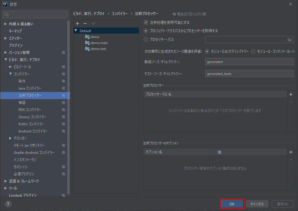 IntelliJ IDEA上でlombokを使えるようにするには、さらに、注釈処理の注釈プロセッサーを使用できるようにする必要がある。その手順は以下の通り。