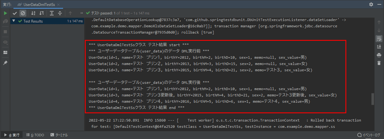 System.out.println("*** UserDataDmlTestSsクラス テスト結果 end ***");