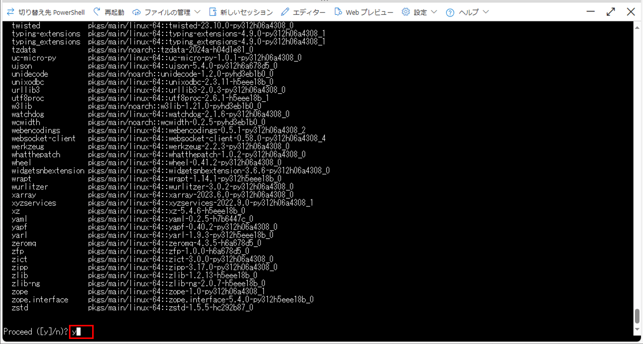 なお、仮想環境作成中に、以下のように、インストールを継続してよいか聞かれるので、「y」を指定する。