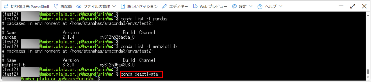 2)「conda deactivate」コマンドを実行すると、以下のように、起動中の仮想環境を停止できる。