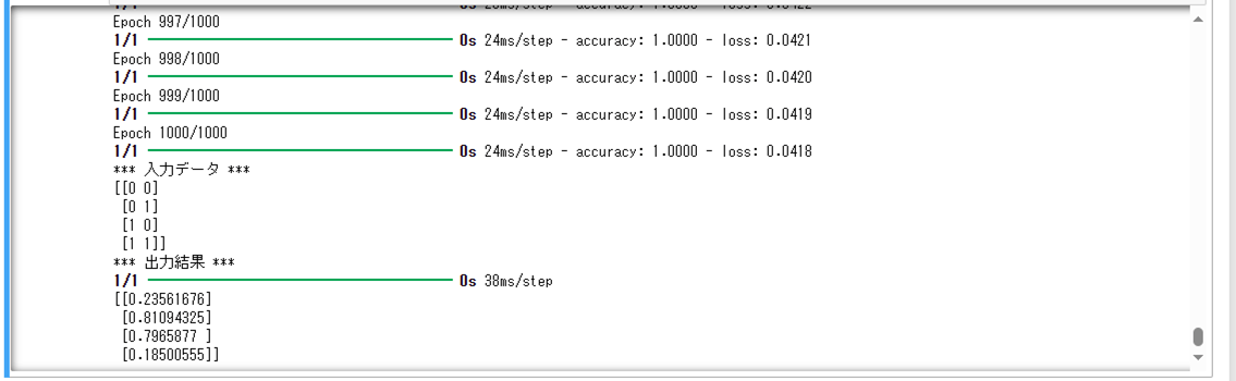 ちなみに、ニューラルネットワークの構造や活性化関数、損失(誤差)関数、最適化関数を修正前の最終実行結果は以下の通りで、繰り返し回数が\(10,000\)回だったことが確認できる。