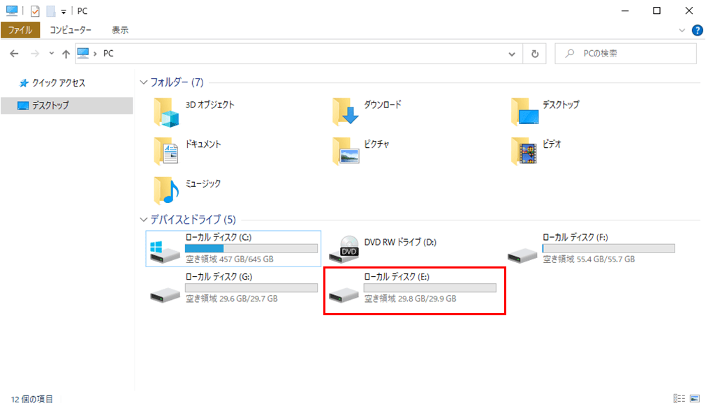5) 上記画面で表示しているパーティションの状態をPC上で確認すると、以下の通り。