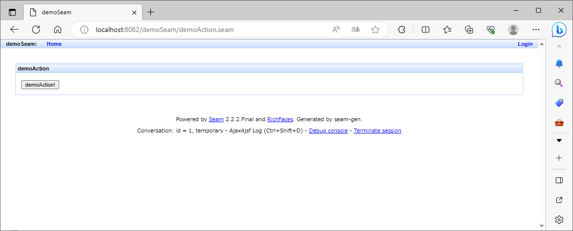 5) 上記画面で「demoAction!」ボタンを押下すると、以下の画面が表示され、メッセージ「demoAction」が表示されることが確認できる。