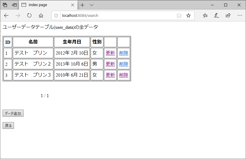 2) 一覧画面にはUSER01スキーマのデータが表示される。ここで「データ追加」ボタンを押下