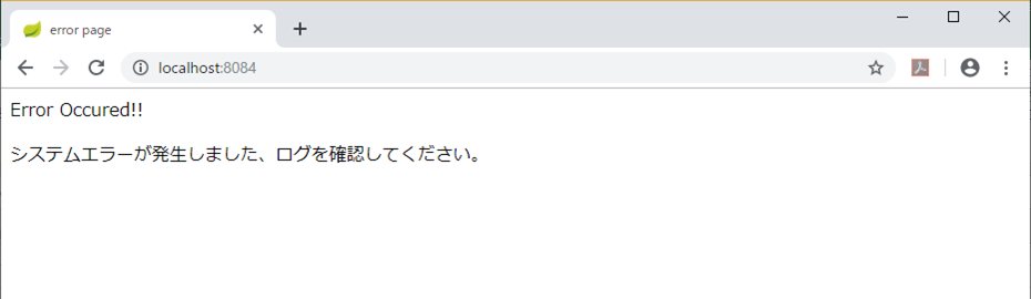 その後、Spring Bootアプリケーションを起動し、「http:// (ホスト名):(ポート番号)」とアクセスした結果は以下の通りで、エラー画面(error.html)に遷移し、パラメータで渡したエラー内容が表示されることが確認できる。