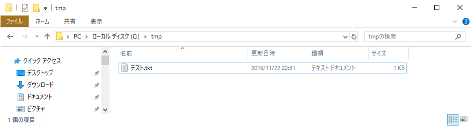 今回作成するサンプルプログラム内でアクセスするファイル「テスト.txt」を作成した。そのファイルの中身は以下の通り。