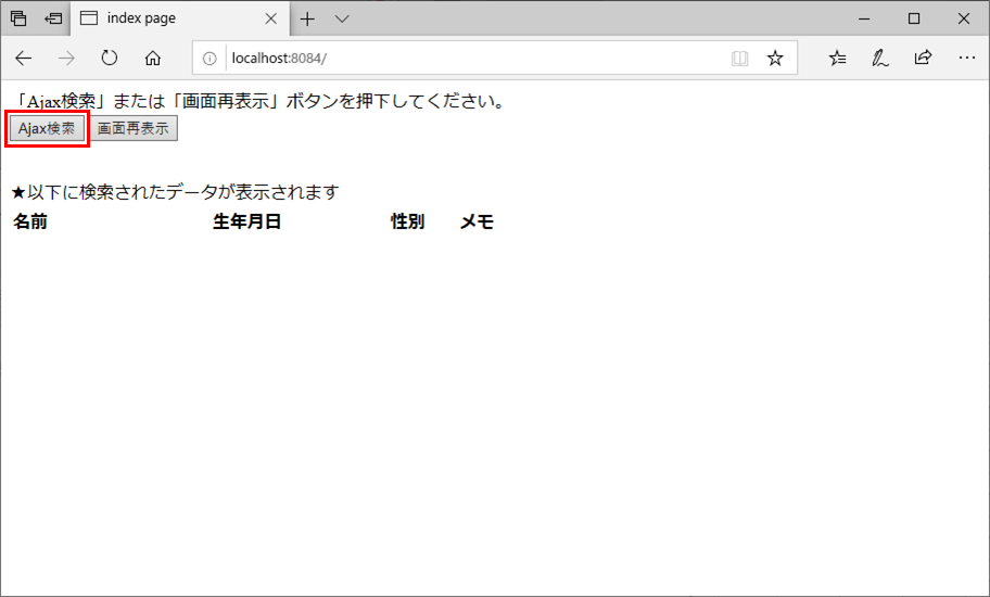 HTMLファイルの内容は以下の通りで、「Ajax検索」ボタンと「画面再表示」ボタンを用意し、ボタン押下時に、それぞれJavaScriptの関数「getUserData」「reload」が呼ばれるようになっている。