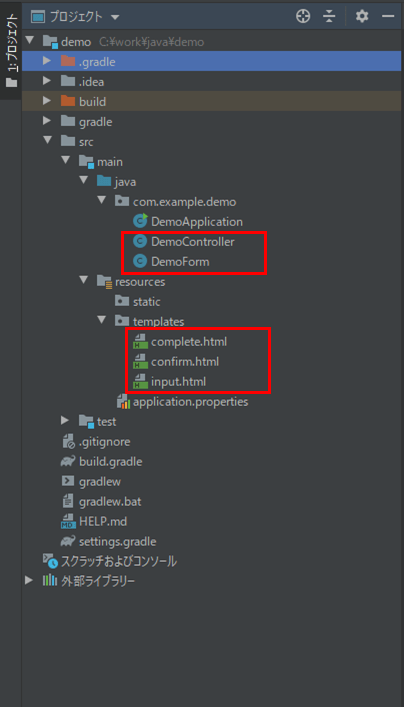 </html>ここでは、formタグの「th:object=”${demoForm}”」を指定することで、DemoController.javaで生成したフォームオブジェクト「demoForm」を参照している。また、フォームの各フィールドには「th:field=”*{XXX}”」と指定することで、demoFormオブジェクトのXXXフィールドへのgetterメソッド・setterメソッドや、XXXメソッドにアクセスしている。