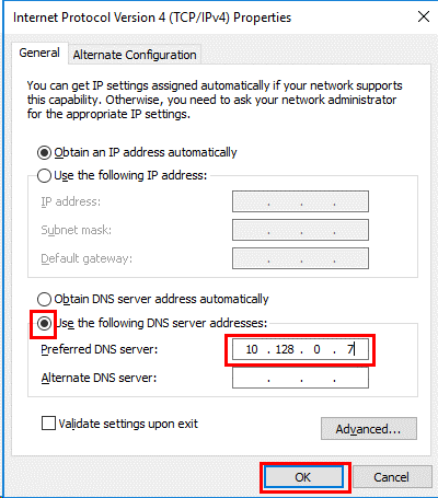 4) 次のDNSサーバーのアドレスを使う(Use the following DNS server addresses)のチェックを入れ、優先DNSサーバー(Preferred DNS server)に、ドメインコントローラ(SQL Serverの搭載の無いWindowsマシン)の内部IPアドレスを入力し、「OK」ボタンを押下