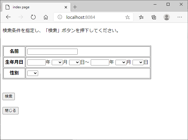 server.port = 8084 # DB接続情報 spring.datasource.url=jdbc:oracle:thin:@localhost:1521:xe spring.datasource.username=USER01 spring.datasource.password=USER01 spring.datasource.driverClassName=oracle.jdbc.driver.OracleDriver # 一覧画面で1ページに表示する行数 demo.list.pageSize=2 # Thymeleafの文字コード spring.thymeleaf.encoding=Shift_JIS # メッセージの文字コード spring.messages.encoding=Shift_JIS # Tomcatの文字コード server.tomcat.uri-encoding=Shift_JIS # HTTP文字コード spring.http.encoding.charset=Shift_JIS spring.http.encoding.enabled=true spring.http.encoding.force=true spring.http.encoding.force-request=true spring.http.encoding.force-response=true
