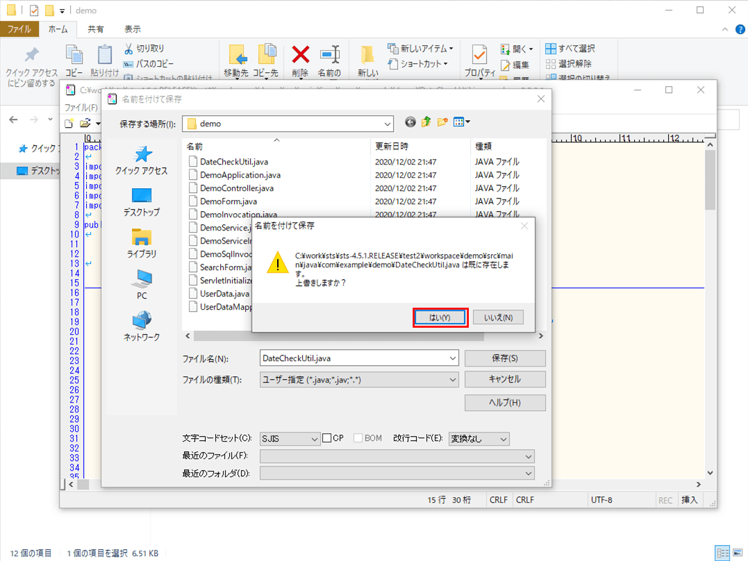 4) 以下のように、上書き確認のダイアログが表示されるので、「はい」ボタンを押下する。
