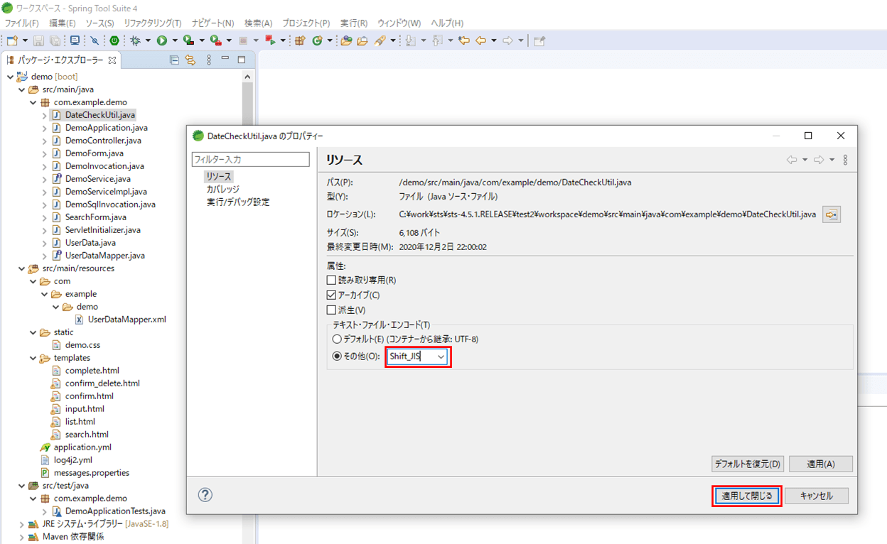 まずは、全てのJavaソース、HTML、XML、CSS、プロパティファイルについて、文字コードを「Shift_JIS」に変更する。その手順は以下の通り。