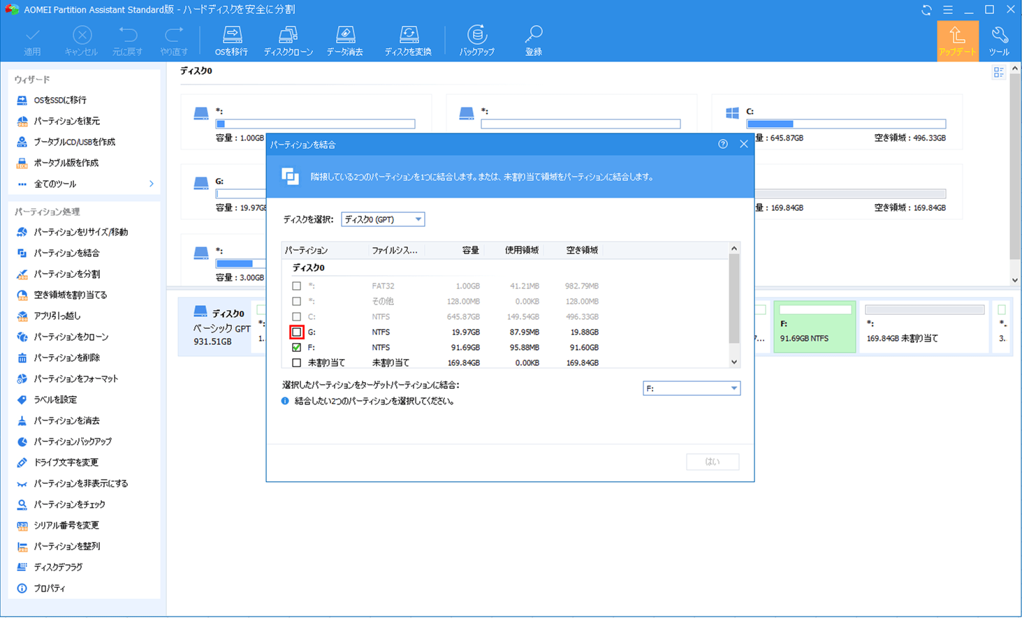 3) 結合するパーティションを選択するための以下の画面が起動するため、Gドライブを選択する。