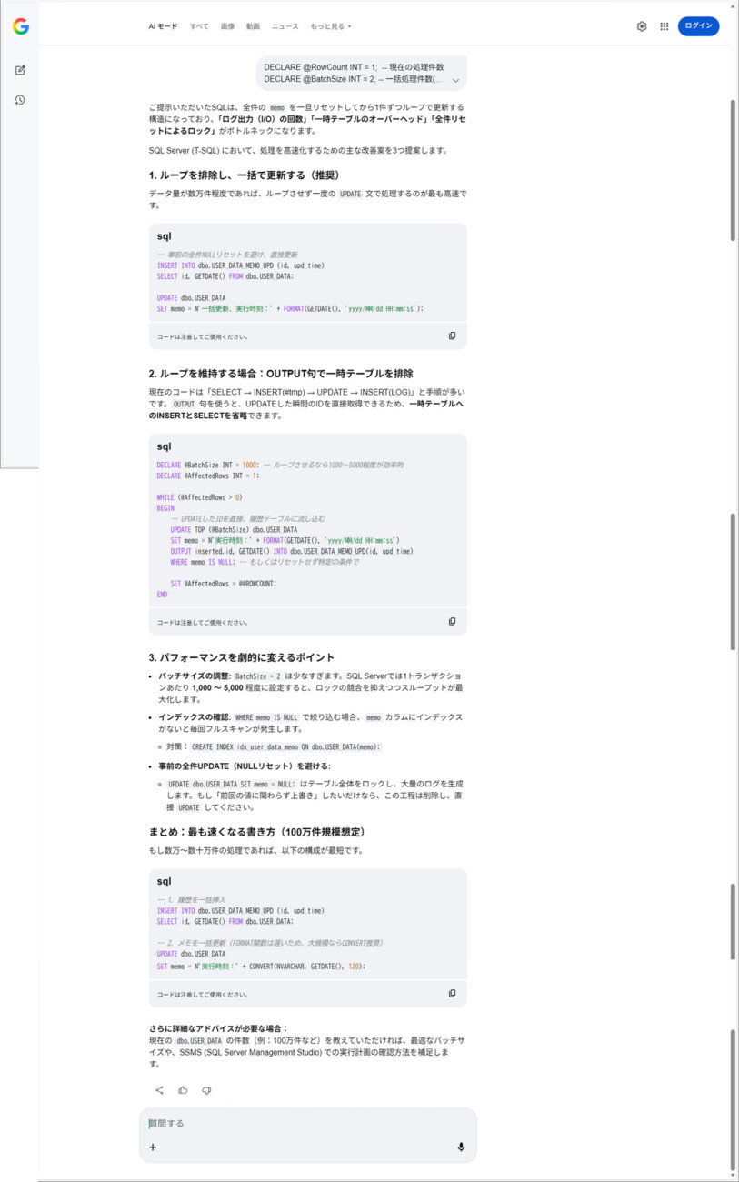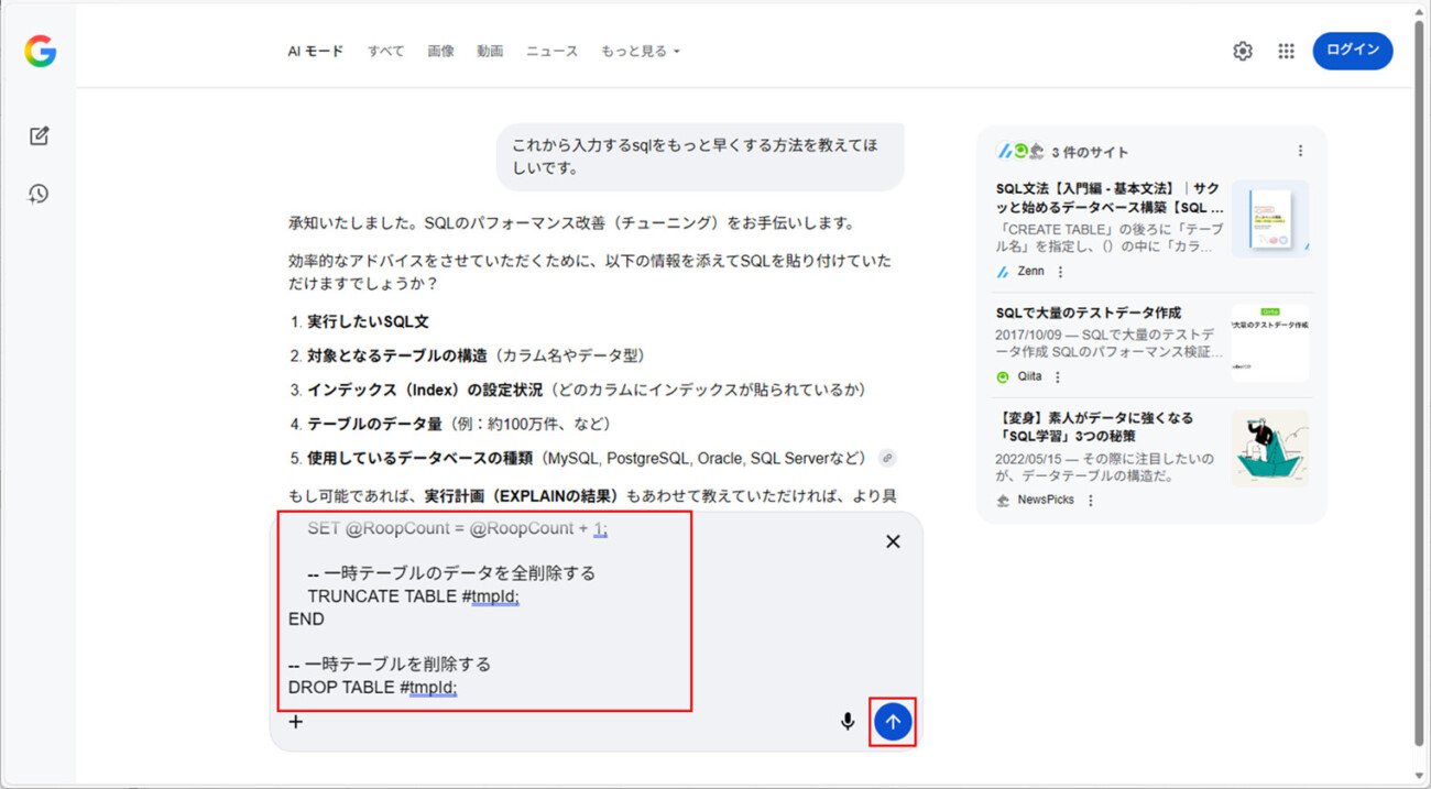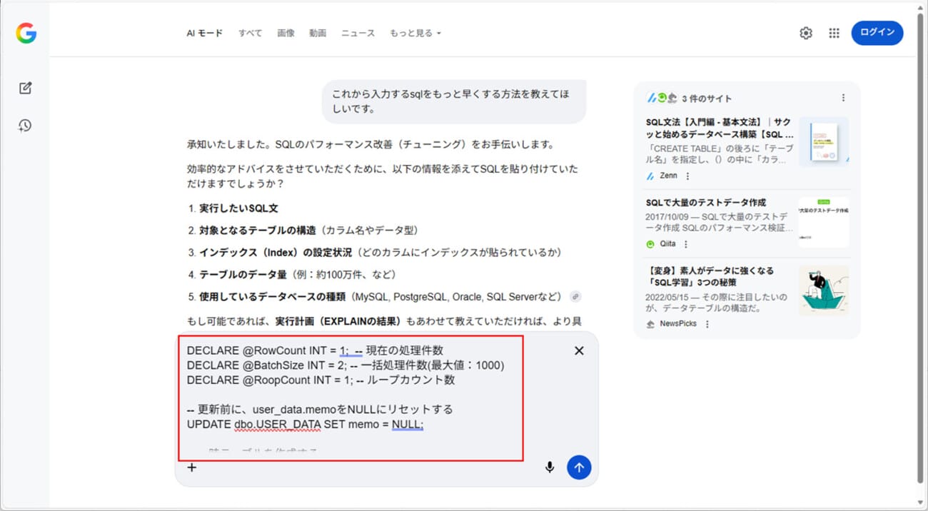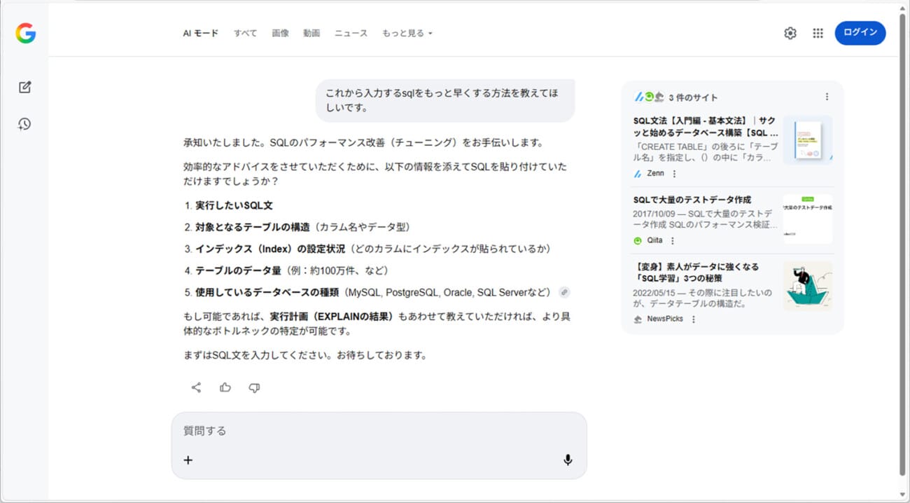 GoogleのAIモードを利用して、SQLを高速化する手順は、以下の通り。
