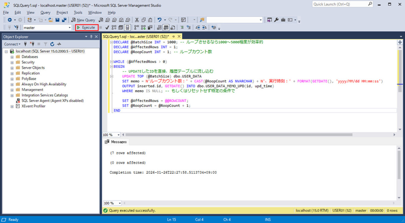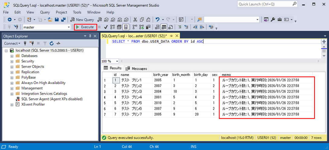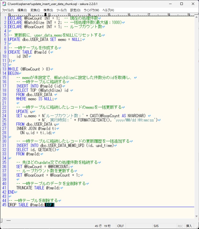 SET memo = N'ループカウント数:' + CAST(@RoopCount AS NVARCHAR) + N'、実行時刻:' + FORMAT(GETDATE(), 'yyyy/MM/dd HH:mm:ss')
