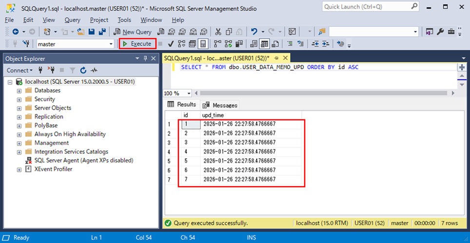 9) 6)のSQLを実行後、SQL修正前と同様、USER_DATA_MEMO_UPDテーブルに、赤枠部分のようにデータ追加されていることが確認できる。