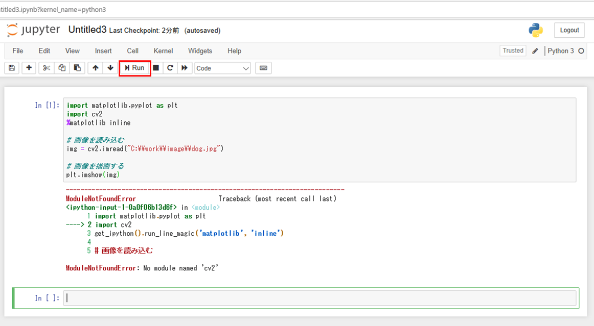 すると、上記のように「ModuleNotFoundError:No module named ‘cv2’」というエラーが表示される。